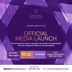 The official media launch will take place on Wednesday, 4 February 2026, at 10:00 a.m., at the AH Hotel, East Legon, convening clergy, professionals, institutions, and stakeholders committed to values-driven leadership and nation-building.